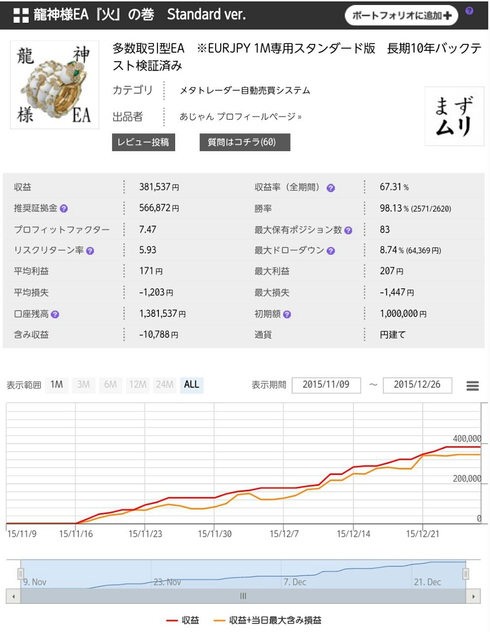 多数取引型EA ※EURJPY 1M専用スタンダード版 長期10年バックテスト検証済み